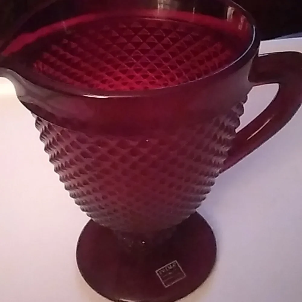 Pre-owned in good used condition. Ruby red diamond point glass pitcher. 1895. Hand wash .Made in Portugal.
