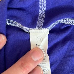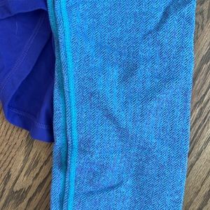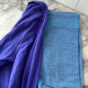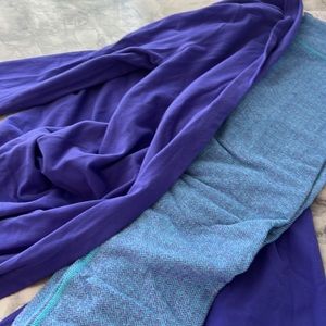 Cute set. Color is more like the last pictures. It’s bright in my kitchen lol. Purple wrap and purple/blue houndstooth leggings. So soft so cute for fall.