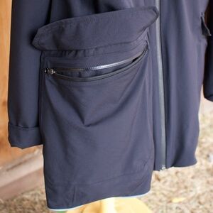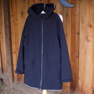 Great condition thick, double-lined, fleece insulated, waterproof zip up jacket. Longer in length, with flattering stitching in the back. Simple yet effective, pairs well for every fall or winter activity. Incredibly warm and cozy! Last two photos show faint spotting.