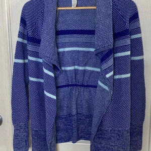 Ivivva Lululemon Girls Feeling Toast Wrap Sweater size 12 Blue Athleisure Cotton. This sweater is pre-owned. Great condition. No flaws. Measurements: 12 inch chest 17 inch waist 28 inch length 25 inch arm length