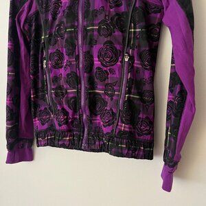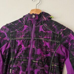Ivivva Trail Runner Lightweight Purple Black Floral Jacket- Girl's Size 12. Purple/black floral rose print, hood, full zip, pockets. Light pilling on cuffs - overall in good condition.