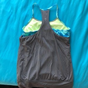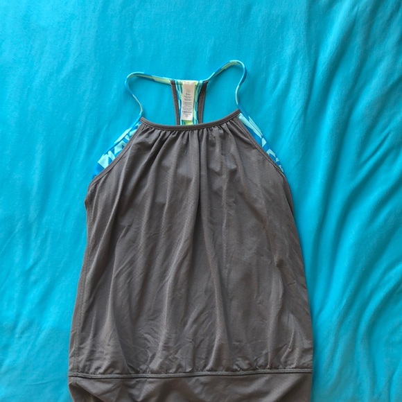 Grey tank with blue and light blue under lay and a built in bra (not padded but room for pads)
