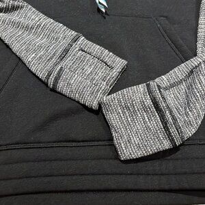 Ivivva black cozy panel neck hoodie grey long sleeves sweater by Lululemon. Excellent condition. Half zip. Thumb holes and flip over cuffs. Size 14.