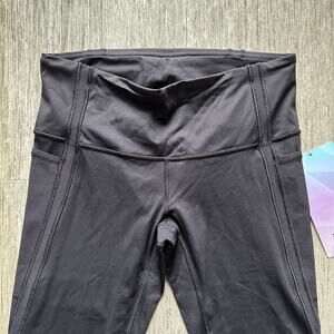 Black high rise 7/8 length "Fresh Focus Pant" leggings with pockets on each thigh and on back of waist. Drawcord in the waist to customize fit. Mesh on the calves and thigh pockets. Stretchy, moisture-wicking, breathable nylon and elastane material. Reflective strip on the back of each calf. New with tags! Excellent condition!