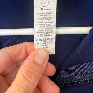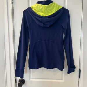 Super cute navy and neon yellow jacket. Perfect for running. Thumb holes and cuffs can cover hands.