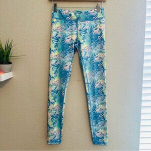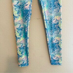 Vibrant leggings with an abstract pattern. Features shades of blue, green, and pink.