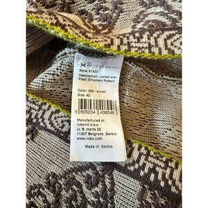 This Ivko Woman jacket sweater features an intricate ornament pattern and pleat detailing, offering a unique and stylish addition to your wardrobe. Crafted from 100% cotton, it provides comfort and breathability. The brown color adds versatility, making it suitable for various occasions. European size 42 is a Large. Smoke free home