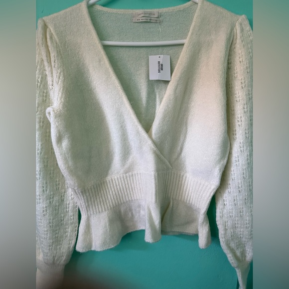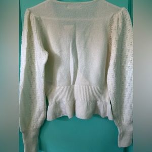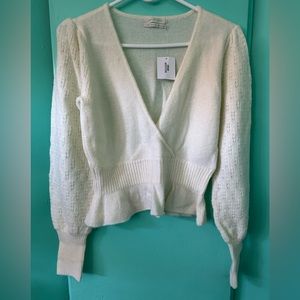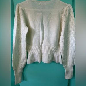 Brand New Beautiful Ivory Top. Features broderie sleeves and hem are a bit ruffled. Super cute top for everyday wear. Material of the top feels a bit like wool just softer. Style of the top is a bit cropped. Unique and Vintage looking top.