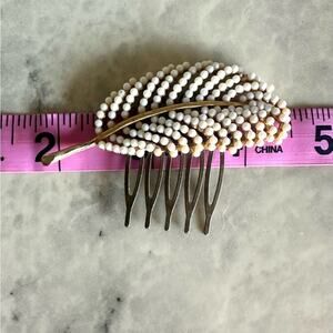 Elegant vintage-inspired hair comb featuring a textured gold leaf design adorned with ivory beaded accents. Perfect for bridal updos, formal events, or adding a sophisticated vintage touch to everyday hairstyles. Handcrafted from repurposed vintage jewelry for a timeless, one-of-a-kind look.