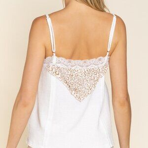 Sweet yet cool waffle tank top featuring leopard printed accents and feminine lace trim detailing, it designed in V neckline, sleeveless with adjustable strap, and see-through lace trim throughout the body this is a good match with any bottom.
