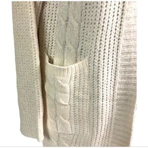 Long sleeve, cable knit, two pockets, solid color, drop shoulder, ribbed trim at closure