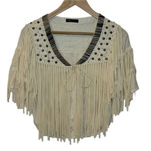 Ivory Cream Studded Beaded Fringe ShortSleeve Tie Front Cardigan Top Coachella S