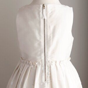 This Ivory Silk Dress by J. Crew (Crewcuts) is Elegant and Sophisticated with Elevated Style!. The slight Bateau neckline is trimmed in a matching band and has slight gathers in the center, creating soft pleats down the bodice. The highlight of this design is the Exposed Gathered Ruffle at the waistline which creates small pleats that fall gently down the skirt, adding a Classic, Chic design with sophisticated elegance. The pleats also create a slight flare and volume to the skirt. An exposed zipper closure at the back also creates added style. The smart design even has hidden side seam pockets that are functional. Dress is fully lined. Gorgeous Dress for Upscale Flower Girls, recitals, wedding guests, or other Special Occasions. New With Tags.