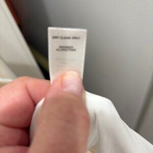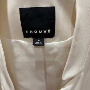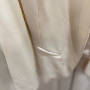 Gently worn but in perfect condition! This ivory blazer from Trouve can go from classic to edgy with its split lapel stand-up collar and slight tuxedo (longer in front than in back) style. Constructed of 60% polyester with 30% spandex the jacket has a crepe fill but with more give than crepe for a comfortable fit. It is lined in 100% polyester. the blazer has two front pockets. It is a perfect style tp go from office to special occasion to casual with jeans!
