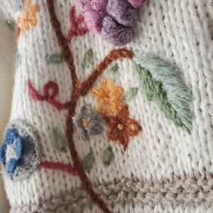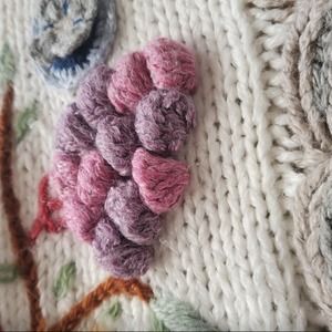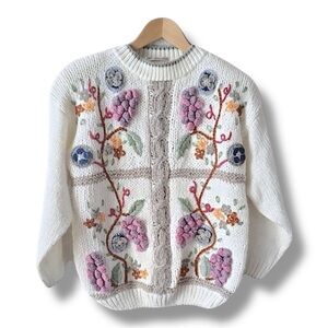 Ivory Crewneck Sweater Embellished Grapes & flowers in Pinks Lavender MED