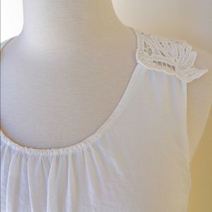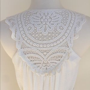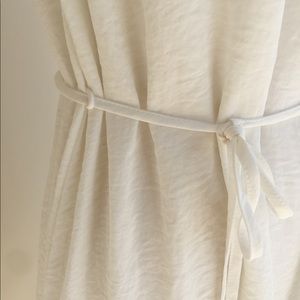 This dress makes you feel like a Grecian goddess! Lightweight ivory dress with crochet back and shoulders. Ties around waist for flattering fit. Worn once. H&M Conscious size 4. 33” long, 34” bust, 28” waist, 100% polyester. Lined but still slightly sheer.