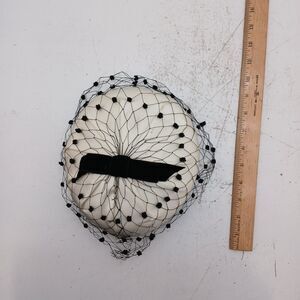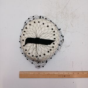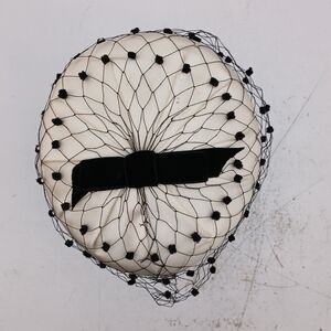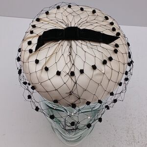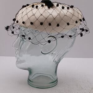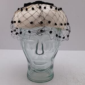 Ivory Fabric & Satin Pillbox Ladies Hat W/ Black Net Veil -Cathay of California
