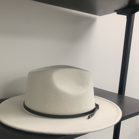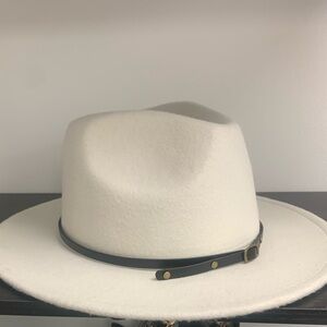 Trendy fedora hat with faux leather band.