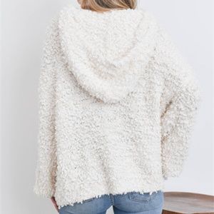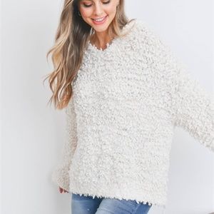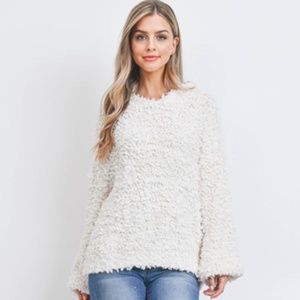 Long puff sleeve hooded neckline fuzzy knit sweater.