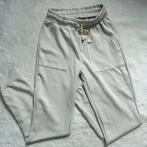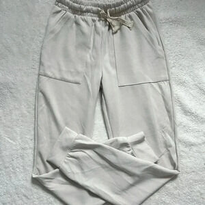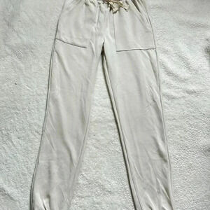 Super soft and comfortable material with a satin type feel. Ivory/cream colored. Size small.
