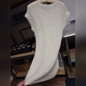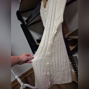 Crocheted ivory dress with decorative buttons down one side. It's very soft yarn. Could be worn just as a dress or with leggings/pants. :D