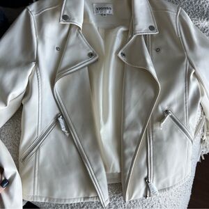 Elevate your style with this chic ivory leather jacket. Perfect for any occasion, this jacket offers both comfort and elegance.