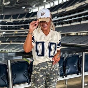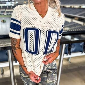 The Ivory & Navy Sweater Jersey blends classic sporty style w/cozy comfort. This top features a soft knit fabric in a crisp ivory base w/bold navy accent. It offers a relaxed fit & a varsity-inspired vibe!