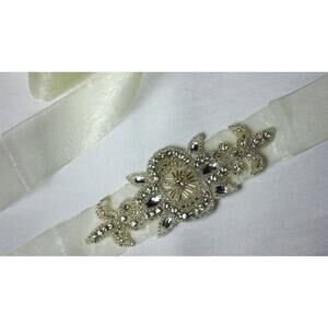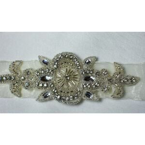 Organza ribbon with hand sewn on rhinestone and beaded applique. The ivory organza ribbon is 1 1/2 inches wide and 108 inches long. The rhinestone applique is 5 inches long.