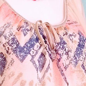 Flowy Light and airy 3/4 sleeve sheer Boho Peasant top with a fun geometric print in blue and coral pink. Wear it under your favorite cardigan or coat for a warmer outfit.
