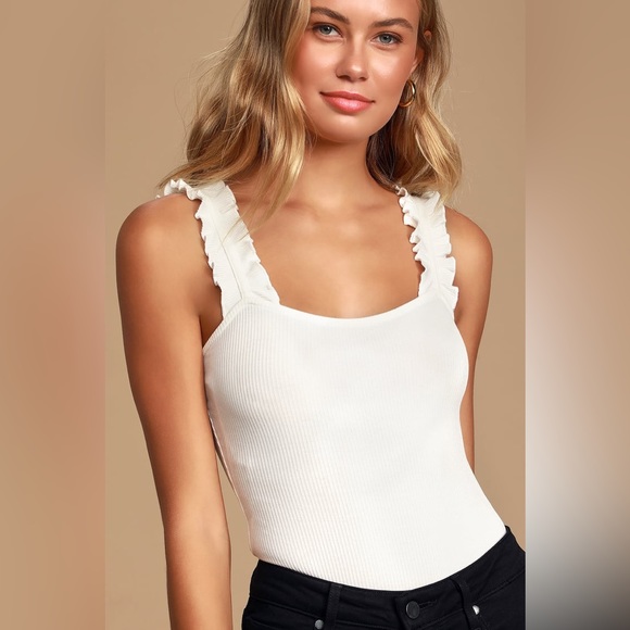 Lightweight ribbed knit shapes this essential bodysuit that features a straight neckline, fitted bodice, and elasticized, ruffled straps. Thong bottoms (with double snap closure) finish the look. Pair with your favorite high-waisted denim for a cute and effortless ensemble!