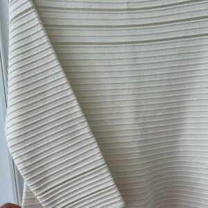 Stylish ivory ribbed dress with 3/4 sleeves. Stretch material (67% rayon, 33% polyester), boat neckline, a-line silhouette, knee length.