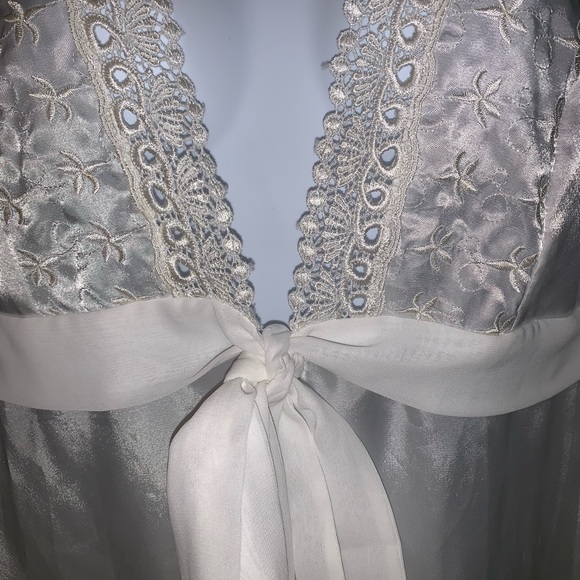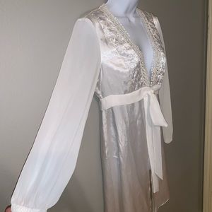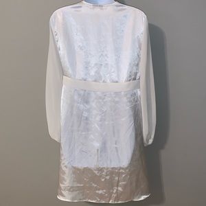 Beautiful ivory colored dressing robe with sheer sleeves and sheer belt. Absolutely gorgeous detailing. Great for wedding, dressing or nighttime. No flaws, tears or stains.