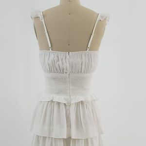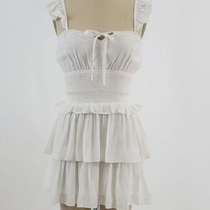 Ivory mini dress with adjustable straps, frilly detail, elastic waistband and zipper closure. Material is 65% Polyester 35 % Cotton