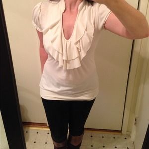 Made by Fleurish. 64% polyester, 28% rayon & 8% spandex. Looks great under a blazer.