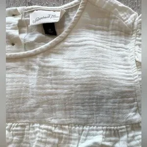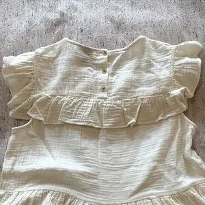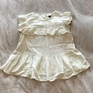 Ivory crinkle cotton top with ruffle details and peplum hem looks glute with denim shorts or jeans.