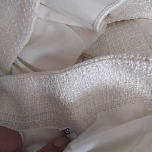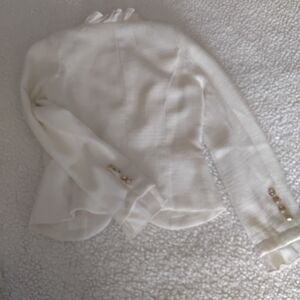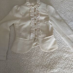 Ivory formal dress set with ruffle-front detail and decorative buttons. Soft textured fabric for a refined look. Layered ruffle hem adds graceful movement. Perfect for special occasions and celebrations.