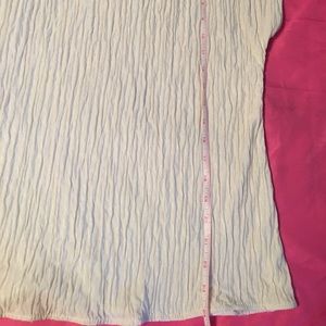 This 100% Polyester top has a very pretty crinkle-style fabric. It’s looks almost pale yellow to me. It runs large cuz I’m usually an XL & it has a generous fit on me(see pic) Measurements are..armpit to armpit=20.25”, length=24” Easy care, very comfy top in good used condition.