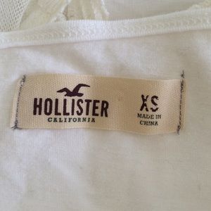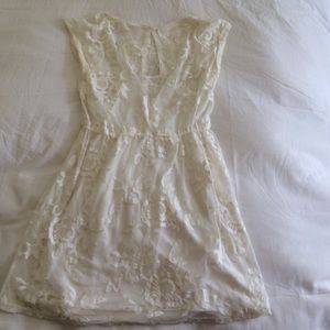 Beautiful lace dress from Hollister with a keyhole cutout in the back, a cinched elastic waist, attached slip dress, rolled short sleeves, and lace detailing throughout. Some signs of wear, but barely worn.