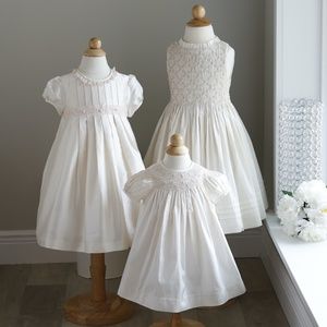This Ivory Silk Dress by Luli & Me is LOVELY! Made of 100% Ivory Dupioni silk, this dress doesn't disappoint with its sweet features. The rounded collar is trimmed in silk piping with an embroidered scalloped lace accented in pink. The bodice is completed with French Tucks that fall into soft pleats down the front of the dress. The tucks have a stunning rare feature consisting of a pink satin ribbon that adorns the front of the dress. The ribbon has an overlay of ivory mesh lace that has sweet embroidered floral vines. Tiny pink satin rosettes are placed evenly across the floral vine detail. The short puff sleeves gather at the hem which has a matching ivory silk band. The back has an upper button closure done in sweet ivory pearlized buttons with Luli's inscribed trademark. Skirt & bodice are lined. Perfect Little Flower Girl Dress for an Ivory & Pink Wedding. Great for any little girl's Special Occasion (Parties, Weddings, etc). Dress is New With Tags and in Perfect Condition!! Beautiful find!