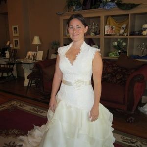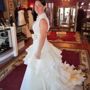Ivory Alencon, dimensional lace appliques on bodice, ivory silk satin faced organza flounces applied asymmetrically on skirt. Asymetrical lace applied around neckline to modest "V" neck that transitions up to high neck halter. Button and loop closure on back neckline. Open back with asymmetrical details. Chapel length train with french bustles.