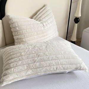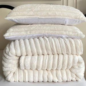 Ivory Soft Faux Fur Cream Bedding Set Striped Comforter Shams King Size Bed New