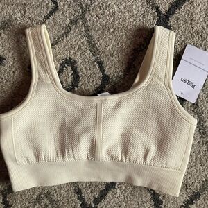 Ivory cream ribber sports bra. Material is thick and not flimsy. Has a great amount of compression. Cute as a crop tank too! No longer new with tags.
