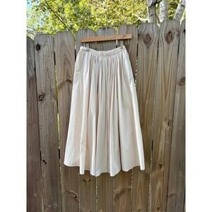 An ivory skirt with a full pleated silhouette and subtle textured weave. The fabric catches light with a soft sheen, giving it depth and movement. It’s ankle-skimming and versatile — the kind of piece you can dress down with a cropped knit or elevate with a tucked-in tank and sleek sandals.