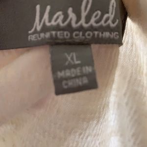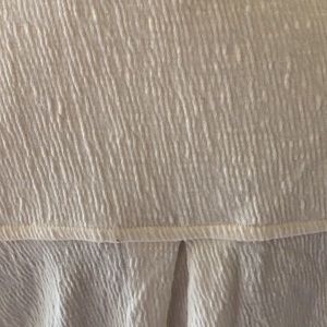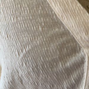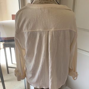 Button- up, with tie front. Light weight with some stretch. Long sleeves that can roll up with sleeve clasp to button up 3/4 length sleeve. Lightly textured material. Never been in a dryer. Excellent condition.