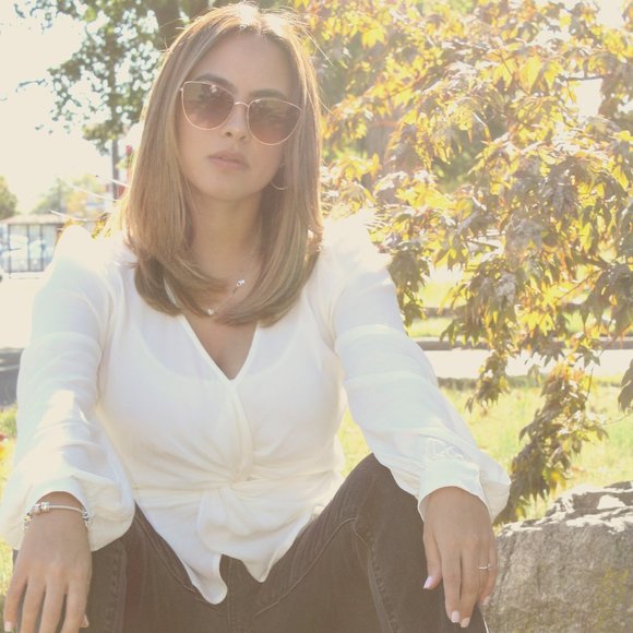 Great shirt for a night out 57% Rayon 43% Viscose Length: 24" Bust: 36" Waist: 28"