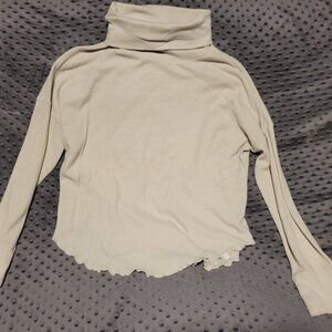 Ivory top with a long neck and ruffled hem. Ideal for autumn weather. Not sure what the brand is. Preowned condition. No notable flaws.