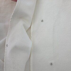 This is a Leslie Fay top size 8.  Measures ptp 18 inches and 20 inches long.  Long sleeves have a layered silky cuff with a ruffle and stone button.  It wraps in front and closes with 3 snaps.  The shoulders are slightly gathered and there is a silky bow with little stones in the middle at the top of the front.  Pictures don't do this top justice.  It really is beautiful and very well made!!  Clean and ready to wear, no spots, stains, holes.