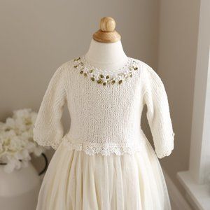 This Little Girl's Tulle and Sweater Dress is most ADORABLE! The top is done in an Ivory 100% Soft, Cotton Knitted yarn with beautiful hand- knitted details. The neckline, sleeve hems and waistline have lovely scalloped hems. Each sleeve has matching green leaves with a single satin ribbon flower with a seed pearl center. The front neckline is lined with matching satin ribbon flowers, mimicking the sleeve details. The back of the top has a two-button closure done in matching ivory petite pearlized buttons. The dress skirt is done is a soft, gathered ivory tulle, lined with a soft ivory pima cotton knit layer. The perfect cozy, soft dress for you Sweet little girl. Perfect condition- worn once briefly. Like New!!!