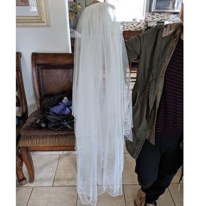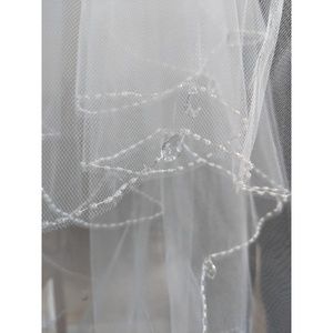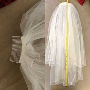 Simple but elegant veil. I bought an Ivory thinking to wear it with my second dress because it's ivory, but I ended up choosing my white dress for the ceremony and it still look great! I loved the little details around the edges. It's a two tier veil. Approximate length 2.5ft.
