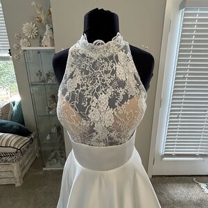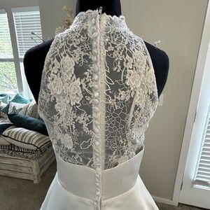 High neck, unlined lace bodice with satin skirt. Dresses a store sample in excellent condition except a small black bark on the front skirt please see photo should come out with dry cleaning dress has not been altered.